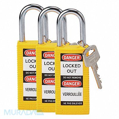 Lockout Padlock Body Color Yellow Body Height 3 in Body Material Nylon Body Thickness 41/50 in Body Width 1 1/2 in Header Danger Horizontal Shackle Clearance 4/5 in Key Style Standard Key Type Keyed Alike Non-Removable Key Yes Resistance Properties Chemical Resistant Corrosion Resistant Temperature Resistant Shackle Diameter 1/4 in Shackle Height 1 1/2 in Shackle Material Hardened Steel Shackle Type Open Vertical Shackle Clearance 1 1/2 in Width Across Shackle 3/4 in