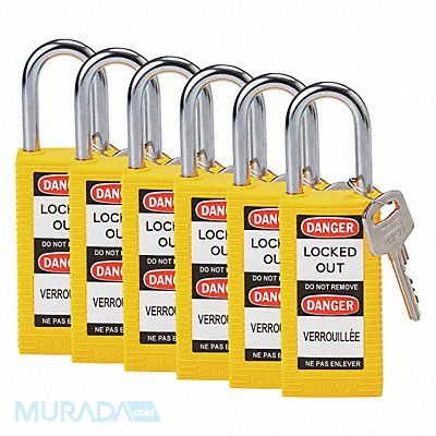 Lockout Padlock Body Color Yellow Body Height 3 in Body Material Nylon Body Thickness 41/50 in Body Width 1 1/2 in Header Danger Horizontal Shackle Clearance 4/5 in Key Style Standard Key Type Keyed Alike Non-Removable Key Yes Resistance Properties Chemical Resistant Corrosion Resistant Temperature Resistant Shackle Diameter 1/4 in Shackle Height 1 1/2 in Shackle Material Hardened Steel Shackle Type Open Vertical Shackle Clearance 1 1/2 in Width Across Shackle 3/4 in