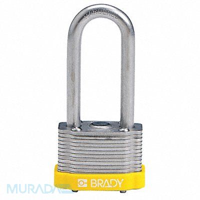 Keyed Padlock Body Color Yellow Body Height 1 1/10 in Body Material Steel Body Thickness 1 in Body Width 1 7/10 in Header None/No Header Horizontal Shackle Clearance 4/5 in Key Style Standard Key Type Keyed Alike Non-Removable Key Yes Resistance Properties Corrosion Resistant Shackle Diameter 1/4 in Shackle Height 2 in Shackle Material Hardened Steel Shackle Type Extended Vertical Shackle Clearance 2 in Width Across Shackle 3/4 in Body Material Coating Laminated