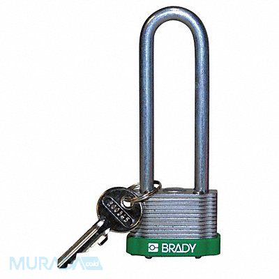 Keyed Padlock Body Color Green Body Height 1 1/10 in Body Material Steel Body Thickness 1 in Body Width 1 7/10 in Header None/No Header Horizontal Shackle Clearance 4/5 in Key Style Standard Key Type Keyed Different Non-Removable Key Yes Resistance Properties Corrosion Resistant Shackle Diameter 1/4 in Shackle Height 3 in Shackle Material Hardened Steel Shackle Type Extended Vertical Shackle Clearance 3 in Width Across Shackle 3/4 in Body Material Coating Laminated