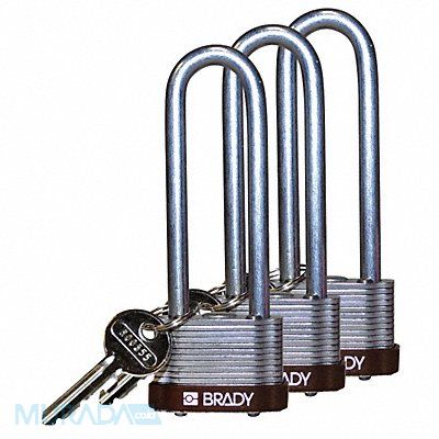 Keyed Padlock Body Color Brown Body Height 1 1/10 in Body Material Steel Body Thickness 1 in Body Width 1 7/10 in Header None/No Header Horizontal Shackle Clearance 4/5 in Key Style Standard Key Type Keyed Alike Non-Removable Key Yes Resistance Properties Corrosion Resistant Shackle Diameter 1/4 in Shackle Height 3 in Shackle Material Hardened Steel Shackle Type Extended Vertical Shackle Clearance 3 in Width Across Shackle 3/4 in Body Material Coating Laminated