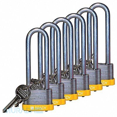 Keyed Padlock Body Color Yellow Body Height 1 1/10 in Body Material Steel Body Thickness 1 in Body Width 1 7/10 in Header None/No Header Horizontal Shackle Clearance 4/5 in Key Style Standard Key Type Keyed Alike Non-Removable Key Yes Resistance Properties Corrosion Resistant Shackle Diameter 1/4 in Shackle Height 3 in Shackle Material Hardened Steel Shackle Type Extended Vertical Shackle Clearance 3 in Width Across Shackle 3/4 in Body Material Coating Laminated