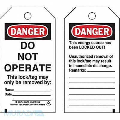 Danger Tag Front Side Legend Danger Do Not Operate Header Danger Language English Legend Type Text Mount Type Cotton String Number of Printed Sides 2 Overall Height 5 3/4 in Overall Width 3 in Reverse Side Legend This Energy Source is Locked Out Sign Background Color White Sign Material Paper Sign Out Sections Date Name Remarks Signage Type Tag Write-On Surface Yes For Location Indoor For Use With Lockout Tagout Grommet Material Metal Header Background Color Black/Red/White