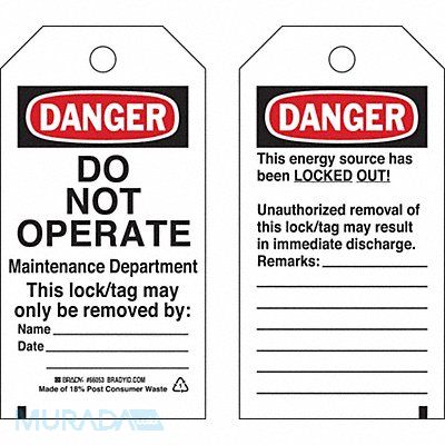 Danger Tag Front Side Legend Danger Do Not Operate Header Danger Language English Legend Type Text Mount Type Nylon Ties Number of Printed Sides 2 Overall Height 5 3/4 in Overall Width 3 in Reverse Side Legend This Energy Source is Locked Out Sign Background Color White Sign Material Polyester Sign Out Sections Date Name Remarks Signage Type Tag Write-On Surface Yes For Location Outdoor For Use With Tagout Device Grommet Material Metal Header Background Color Black/Red/White