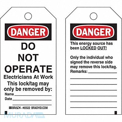 Danger Tag Front Side Legend Danger Do Not Operate Header Danger Language English Legend Type Text Mount Type Nylon Ties Number of Printed Sides 2 Overall Height 5 3/4 in Overall Width 3 in Reverse Side Legend This Energy Source is Locked Out Sign Background Color White Sign Material Polyester Sign Out Sections Remarks Signage Type Tag Write-On Surface Yes For Location Indoor Outdoor For Use With Tagout Device Grommet Material Metal Header Background Color Black/Red/White