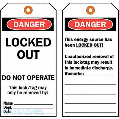 Danger Tag Front Side Legend Locked Out Device Header Danger Language English Legend Type Text Mount Type Cotton String Number of Printed Sides 2 Overall Height 5 3/4 in Overall Width 3 in Reverse Side Legend This Energy Source is Locked Out Sign Background Color White Sign Material Paper Sign Out Sections Date Name Remarks Signage Type Tag Write-On Surface Yes For Location Indoor For Use With Lockout Tagout Grommet Material Brass Header Background Color Black/Red/White