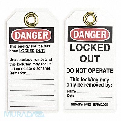 Danger Tag Front Side Legend Locked Out Device Header Danger Language English Legend Type Text Mount Type Nylon Ties Number of Printed Sides 2 Overall Height 5 3/4 in Overall Width 3 in Reverse Side Legend This Energy Source is Locked Out Sign Background Color White Sign Material Polyester Sign Out Sections Date Name Remarks Signage Type Tag Write-On Surface Yes For Location Indoor Outdoor For Use With Tagout Device Grommet Material Metal