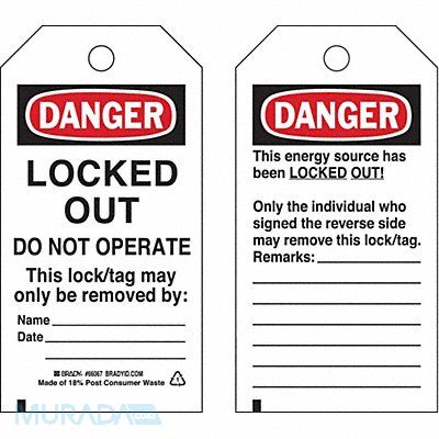 Danger Tag Front Side Legend Locked Out Device Header Danger Language English Legend Type Text Mount Type Nylon Ties Number of Printed Sides 2 Overall Height 5 3/4 in Overall Width 3 in Reverse Side Legend This Energy Source is Locked Out Sign Background Color White Sign Material Polyester Sign Out Sections Date Name Remarks Signage Type Tag Write-On Surface Yes For Location Outdoor For Use With Tagout Device Grommet Material Metal Header Background Color Black/Red/White