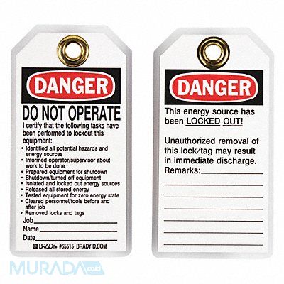 Danger Tag Front Side Legend Danger Do Not Operate Header Danger Language English Legend Type Text Mount Type Nylon Ties Number of Printed Sides 2 Overall Height 5 3/4 in Overall Width 3 in Reverse Side Legend This Energy Source is Locked Out Sign Background Color White Sign Material Polyester Sign Out Sections Date Job Name Remarks Signage Type Tag Write-On Surface Yes For Location Indoor Outdoor For Use With Tagout Device Grommet Material Metal