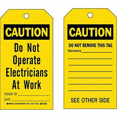 Caution Tag Front Side Legend Danger Do Not Operate Header Caution Language English Legend Type Text Mount Type Nylon Ties Number of Printed Sides 2 Overall Height 5 3/4 in Overall Width 3 in Reverse Side Legend Do Not Remove Tag Sign Background Color Yellow Sign Material Polyester Sign Out Sections Date Remarks Signed By Signage Type Tag Write-On Surface Yes For Location Indoor Outdoor For Use With General Equipment Grommet Material Metal Header Background Color Black
