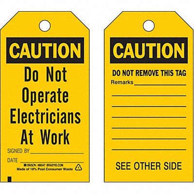 Caution Tag Front Side Legend Danger Do Not Operate Header Caution Language English Legend Type Text Mount Type Nylon Ties Number of Printed Sides 2 Overall Height 5 3/4 in Overall Width 3 in Reverse Side Legend Do Not Remove Tag Sign Background Color Yellow Sign Material Polyester Sign Out Sections Date Remarks Signed By Signage Type Tag Write-On Surface Yes For Location Outdoor For Use With General Equipment Grommet Material Metal Header Background Color Black