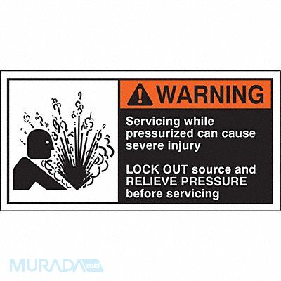 Label Horizontal Rectangle Number of Printed Sides 1 English Sign Legend Servicing while pressurized can cause severe injury LOCK OUT source and RELIEVE PRESSURE before servicing Sign Legend Style Symbol and Text Package Quantity 5