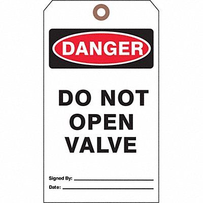 Danger Tag Subject Matter Authorized Personnel and Restricted Access Sign Legend Danger Do Not Open Valve Legend Same on Both Sides No Sign Header Danger Sign Header Background Color Black Red Tag Style Single Part Shape Rectangular Safety Tag Legend - Back Side Do Not Remove This Tag Sign Header -Back Side Danger Package Quantity 25