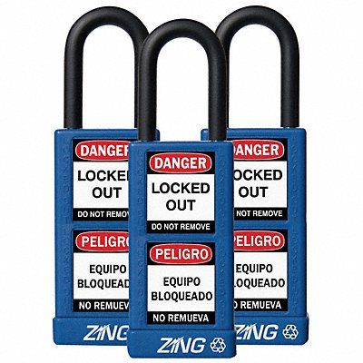 Lockout Padlock Body Color Blue Body Height 3 in Body Material Aluminum Body Thickness 3/4 in Body Width 1 1/2 in Header Danger Horizontal Shackle Clearance 3/4 in Key Style Standard Key Type Keyed Alike Non-Removable Key Yes Resistance Properties Corrosion Resistant Shackle Diameter 1/4 in Shackle Height 1 1/2 in Shackle Material Steel Shackle Type Open Vertical Shackle Clearance 1 in Width Across Shackle 11/16 in Body Material Coating Plastic Encased Body Shape Rectangular