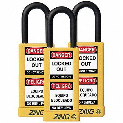 Lockout Padlock Body Color Yellow Body Height 3 in Body Material Aluminum Body Thickness 3/4 in Body Width 1 1/2 in Header Danger Horizontal Shackle Clearance 3/4 in Key Style Standard Key Type Keyed Alike Non-Removable Key Yes Resistance Properties Corrosion Resistant Shackle Diameter 1/4 in Shackle Height 1 1/2 in Shackle Material Steel Shackle Type Open Vertical Shackle Clearance 1 in Width Across Shackle 11/16 in Body Material Coating Plastic Encased Body Shape Rectangular