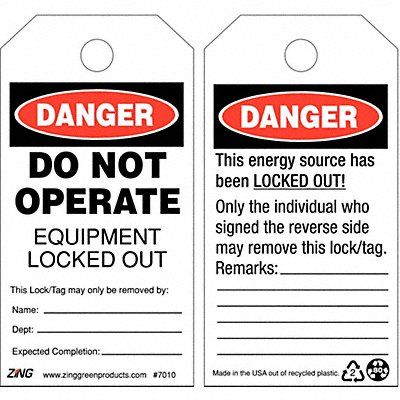 Danger Tag Front Side Legend Danger Do Not Operate Header Danger Language English Legend Type Text Mount Type Cable Tie Number of Printed Sides 2 Overall Height 5 3/4 in Overall Width 3 in Reverse Side Legend This Energy Source is Locked Out Sign Background Color White Sign Material Plastic Sign Out Sections Dept Expected Completion Name Signage Type Tag Write-On Surface Yes For Location Indoor Outdoor Header Background Color Black/Red/White Header Text Color White