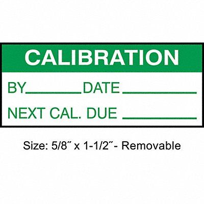 Calibration Label Adhesive Adhesive Adhesive Material Acrylic Adhesive Type Permanent Adhesive Label Color Green White Label Diameter Not Applicable Label Height 5/8 in Label Material Polyester Label Shape Rectangle Label Width 1 1/2 in Language English Number of Labels 350 Preprinted Legend By_______ Date_______ Next Cal. Due_______ Product Type Calibration Label Subject Matter Calibration Standards ISO Quality Write on Surface Yes Package Quantity 350