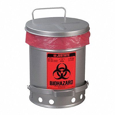 Biohazard Waste Can 6 gal Can Capacity Silver Can Material Steel Height 15 7/8 in Outside Dia 11 7/8 in Standards FM OSHA 29 CFR 1910.1030