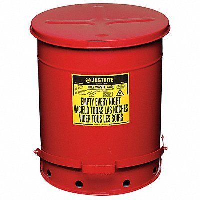 E6821 Oily Waste Can Safety Can Mounting Style Floor Can Capacity 14 gal Can Material Galvanized Steel Red Safety Can Lid Type Foot Operated Self Closing Height 20 1/4 in Outside Dia 16 1/16 in Finish Powder Coated
