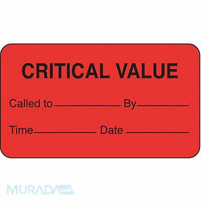 Label Adhesive Adhesive Adhesive Material Acrylic Adhesive Type Removable Adhesive Label Color Red Label Diameter Not Applicable Label Height 1 in Label Material Paper Label Shape Rectangle Label Width 1 3/4 in Language English Number of Labels 1 000 Package Type Roll Preprinted Images Not Applicable Preprinted Legend Critical Value Called to____ By____ Time_____ Date____ Product Type Label Subject Matter Critical Value Write on Surface Yes Package Quantity 1000