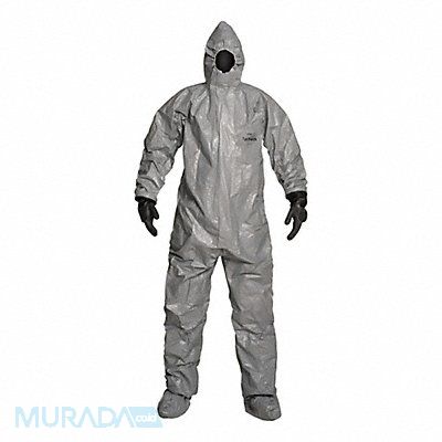 Hooded Coveralls Level of Protection Liquid Tight Coverall Style Hooded Coverall Disposable Clothing Size 5XL Disposable Clothing Primary Material Tychem(R) 6000 Series Tychem(R) 6000 Ankle Style Attached Socks Cuff Styles Elastic Seam Style Taped Gray Closure Type Zipper Inseam 30 3/4 in Fits Chest Size 58 3/4 in to 62 1/4 in Package Quantity 6