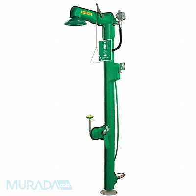 Shower with Eyewash Barrier Free No Bowl Style No Bowl Coverage Eyes and Face Electrical Connection Type Hardwired Hazardous Location Rating Class I/Division 2 Includes AXION(R) MSR Hydrodynamic Designed Green ABS Plastic 10-5/8 in Showerhead Inspection Tag Powder-Coated Cast Iron 9 in Diameter Floor Flange Thermostatically Controlled Electric Heat Traced Cable Protected by 3/4 in (1.9 cm) Insulation and UV Protected ABS Green Plastic Jacket Universal Sign Includes Foot Pedal No