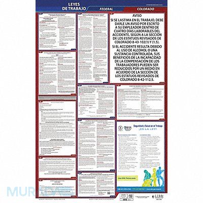 Labor Law Poster Compliance Type Federal and State Labor Law FMLA Notice Included Not Applicable Height 40 in Language Spanish Material Plastic Number of Posters Included 1 Product Type Poster Subject Matter Labor Law Subscription Length 3 yr Width 24 in State/Province CO Municipality Not Applicable Workers Compensation Notice Included Not Applicable