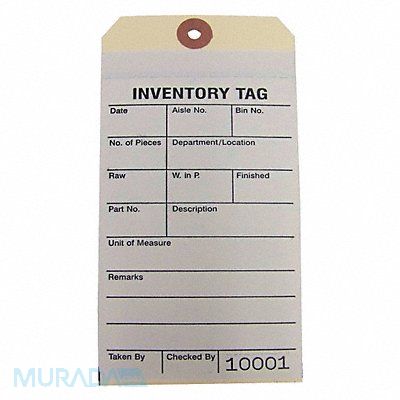 Inventory Tag Compatible Tag Holder Mfr Part Number Not Applicable Compatible Tag Insert Mfr Part Number Not Applicable Fastener Attachment Length Not Applicable Fastener Type Not Applicable Height 6 1/4 in Indoor/Outdoor Usage Indoor Lamination Type Not Laminated Language English Mounting Hole Reinforcement Type Fiber Disc Mounting Hole Size 3/16 in Number of Tags 100 Preprinted Images (Reverse Side) Not Applicable Preprinted Images Inventory Header