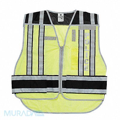 E7855 Safety Vest Black Green Police 2 Vest Size 2XL Vest Closure Type Zipper Vest Material Polyester Fits Chest Size 64 in Vest Length 27 1/2 in Stripe Color Silver Standards ANSI 107
