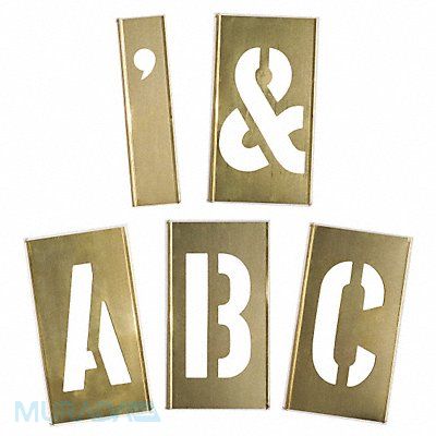 Stencil Character Type Letter/Number Set Duty Moderate FAA AC 150/5340-1K Compliant Not Applicable Font Not Applicable Included Characters Messages and Symbols 0 to 9 A to Z Punctuation Includes (33) Letters Individual Character Height 12 in Individual Character Width 5 in Interlocking Yes Interlocking Orientation Not Applicable Material Brass Message or Symbol Height Not Applicable Message or Symbol Width Not Applicable MUTCD Compliant Not Applicable Number of Pieces 33