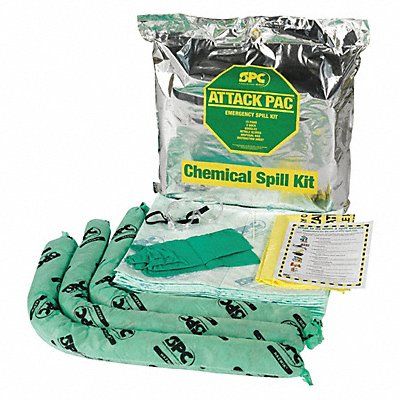 Spill Kit Fluids Absorbed Harsh Chemicals Volume Absorbed Per Kit 7 gal Container Type Bag 7 gal Container Capacity Silver Filled Sorbents Included (15) 15 in W x 19 in L Harsh Chemical Pads (3) 3 in Dia x 4 ft L Harsh Chemical Socks PPE Included Goggles Nitrile Gloves Additional Components Included Disposal Bag Handbook Lockable No Static Dissipative No UV Resistant Yes Includes Mounting Fasteners No