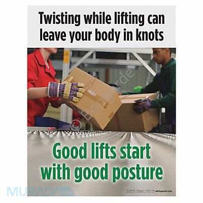 Safety Poster Shape Vertical Rectangle Safety Banner Legend Twisting While Lifting Can Leave Your Body In Knots Good Lifts Start With Good Posture Sign Legend Style Symbol and Text Printed Language English Background Color Various Number of Printed Sides 1 Width 17 in Height 22 in Thickness 0.005 in