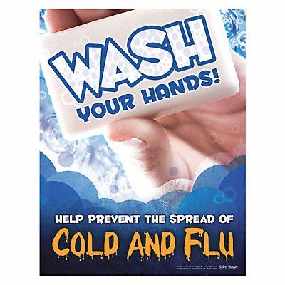 Safety Poster Shape Vertical Rectangle Safety Banner Legend Wash Your Hands Help Prevent The Spread Of Cold And Flu Sign Legend Style Symbol and Text Printed Language English Background Color Various Number of Printed Sides 1 Width 17 in Height 22 in Thickness 0.005 in