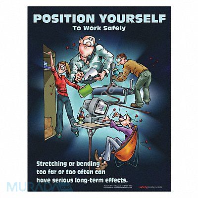 Safety Poster Shape Vertical Rectangle Safety Banner Legend Position Yourself To Work Safely. Stretching Or Bending Too Often Can Have Serious Long-Term Effects Sign Legend Style Symbol and Text Printed Language English Background Color Various Number of Printed Sides 1 Width 17 in Height 22 in Thickness 0.005 in