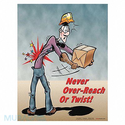 Safety Poster Shape Vertical Rectangle Safety Banner Legend Never Over Reach Or Twist Sign Legend Style Symbol and Text Printed Language English Background Color Various Number of Printed Sides 1 Width 17 in Height 22 in Thickness 0.005 in