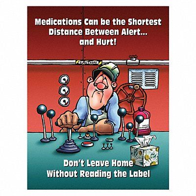 Safety Poster Shape Vertical Rectangle Safety Banner Legend Medications Can Be The Shortest Distance Between Alert And Hurt Dont Leave Home Without Reading The Label Sign Legend Style Symbol and Text Printed Language English Background Color Various Number of Printed Sides 1 Width 17 in Height 22 in Thickness 0.005 in