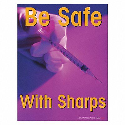 Safety Poster Shape Vertical Rectangle Safety Banner Legend Be Safe With Sharps Sign Legend Style Symbol and Text Printed Language English Background Color Various Number of Printed Sides 1 Width 17 in Height 22 in Thickness 0.005 in