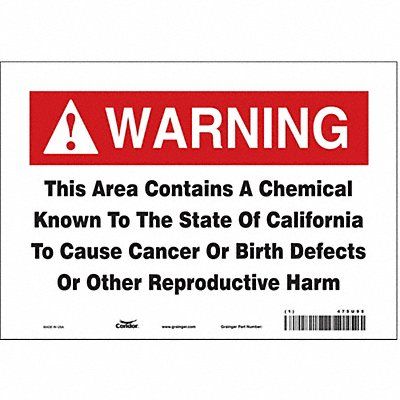 Safety Sign THIS AREA CONTAINS A CHEMICAL KNOWN TO THE STATE OF CALIFORNIA TO CAUSE CANCER OR BIRTH DEFECTS OR OTHER REPRODUCTIVE HARM Vinyl Height 7 in Width 10 in Header No Header Legend Style Text Thickness 0.004 in Sign Shape Rectangle Operating Temp Range -20 Degrees to 176 Degrees F Retroreflective Grade Not Retroreflective