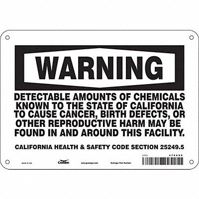 Safety Sign DETECTABLE AMOUNTS OF CHEMICALS KNOWN TO THE STATE OF CALIFORNIA TO CAUSE CANCER BIRTH DEFECTS OR OTHER REPRODUCTIVE HARM MAY BE FOUND IN AND AROUND THIS FACILITY. CALIFORNIA HEALTH SAFETY CODE SECTION 25249.5 Plastic Height 7 in Width 10 in Header No Header Legend Style Text Thickness 0.055 in Sign Shape Rectangle Operating Temp Range -90 Degrees to 168 Degrees F Retroreflective Grade Not Retroreflective