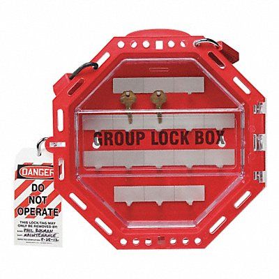 Group Lockout Box Box Color Red Box Material Plastic Door Opening Type Hinged For Maximum Padlock Shackle Diameter 9/32 in Maximum Number of Padlocks 44 Number of Key Hooks 16 Overall Depth 3.5 in Overall Height 13 in Overall Width 13 in Mounting Location Wall Includes Top Carry Handle Includes Window Clear Window Legend Group Lock Box Number of Mounting Holes 2 Resistance Properties Impact Resistant Standards OSHA 29 CFR 1910.147