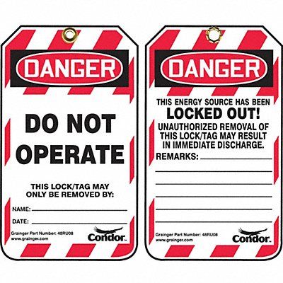 Lockout Tag Front Side Legend Danger Do Not Operate Header Danger Language English Legend Type Text Mount Type Cable Tie Number of Printed Sides 2 Overall Height 5 3/4 in Overall Width 3 1/4 in Reverse Side Legend This Energy Source is Locked Out Sign Background Color Red/White Sign Material Plastic Sign Out Sections Remarks Signage Type Tag Write-On Surface Yes For Location Indoor Outdoor Grommet Material Brass Header Background Color Black/Red/White Header Text Color White