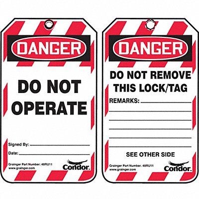 Lockout Tag Front Side Legend Do Not Operate Header Danger Language English Legend Type Text Mount Type Cable Tie Number of Printed Sides 2 Overall Height 5 3/4 in Overall Width 3 1/4 in Reverse Side Legend Do Not Remove Tag Sign Background Color Red/White Sign Material Plastic Sign Out Sections Remarks Signage Type Tag Write-On Surface Yes For Location Indoor Outdoor Grommet Material Brass Header Background Color Black/Red/White Header Text Color White Hole Diameter 3/8 in
