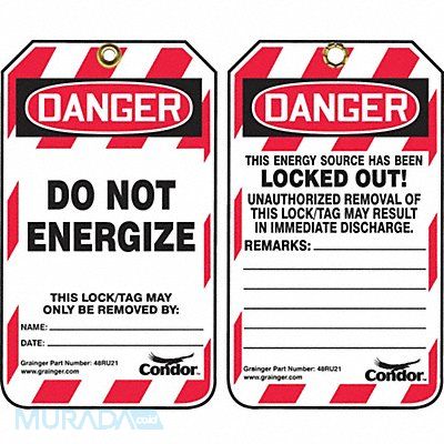 Lockout Tag Front Side Legend Do Not Remove Tag Header Danger Language English Legend Type Text Mount Type Cable Tie Number of Printed Sides 2 Overall Height 5 3/4 in Overall Width 3 1/4 in Reverse Side Legend This Energy Source is Locked Out Sign Background Color Red/White Sign Material Plastic Sign Out Sections Remarks Signage Type Tag Write-On Surface Yes Grommet Material Brass Header Background Color Black/Red/White Header Text Color White Hole Diameter 3/8 in