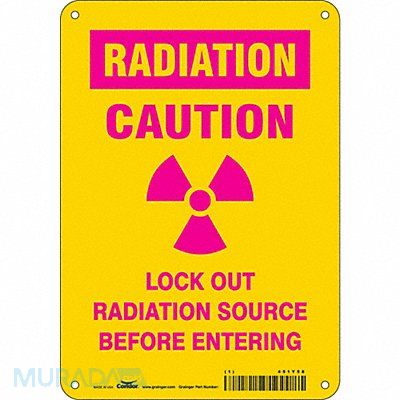 Safety Sign Horizontal Rectangle Number of Printed Sides 1 English Sign Format Other Format Sign Legend Caution Lock Out Radiation Source Before Entering Sign Legend Background Color Pink Yellow Sign Legend Style Symbol and Text