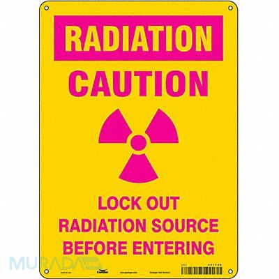 Safety Sign Vertical Rectangle Number of Printed Sides 1 English Sign Format Other Format Sign Legend Caution Lock Out Radiation Source Before Entering Sign Legend Background Color Pink Yellow Sign Legend Style Symbol and Text