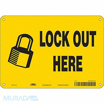 Safety Sign Vertical Rectangle Number of Printed Sides 1 English Sign Format Other Format Sign Legend Lock Out Here Sign Legend Background Color Yellow Sign Legend Style Symbol and Text