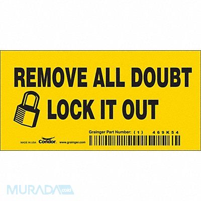 Safety Sign Horizontal Rectangle Number of Printed Sides 1 English Sign Format Other Format Sign Legend Remove All Doubt Lock It Out Sign Legend Background Color Yellow Sign Legend Style Symbol and Text