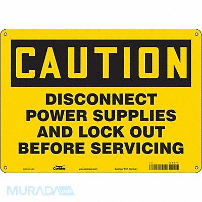 Safety Sign Horizontal Rectangle Number of Printed Sides 1 English Sign Format Traditional OSHA Sign Legend Disconnect Power Supplies And Lock Out Before Servicing Sign Legend Background Color Yellow Sign Legend Style Text
