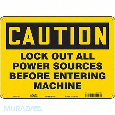 Safety Sign Horizontal Rectangle Number of Printed Sides 1 English Sign Format Traditional OSHA Sign Legend Lock Out All Power Sources Before Entering Machine Sign Legend Background Color Yellow Sign Legend Style Text