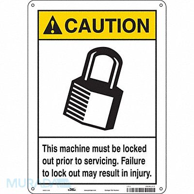 Safety Sign Vertical Rectangle Number of Printed Sides 1 English Sign Format ANSI/OSHA Format Sign Legend This Machine Must Be Locked Out Prior To Servicing. Failure To Lock Out May Result In Injury. Sign Legend Background Color White Sign Legend Style Symbol and Text